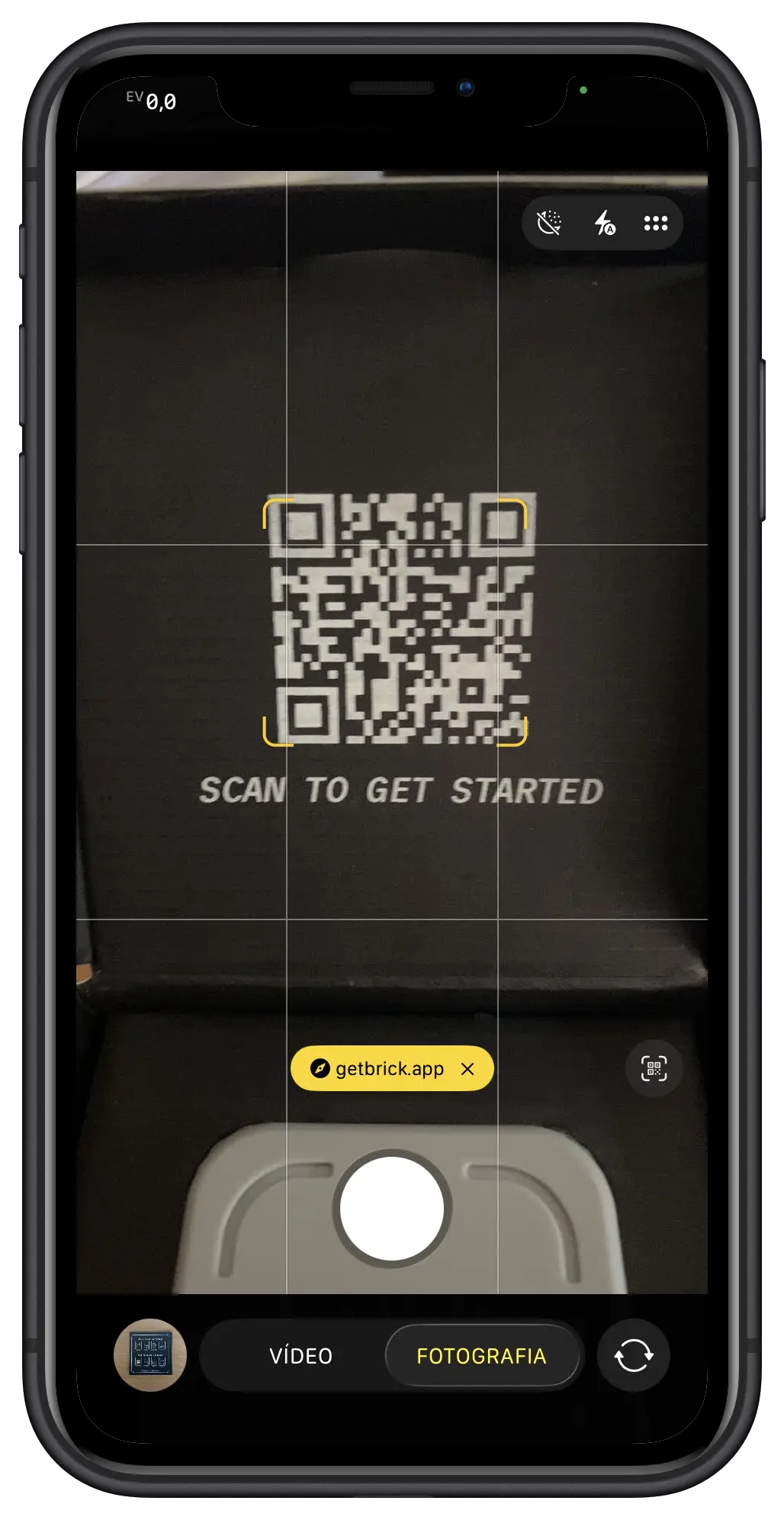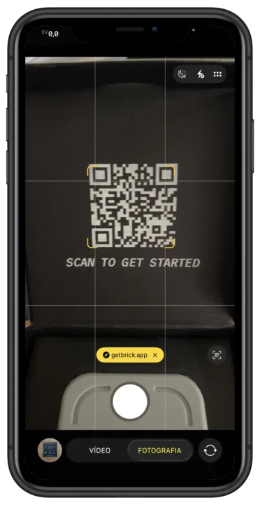 No interior da caixa, encontra um QR code. Basta apontar a câmara do seu telemóvel e seguir as instruções para transferir a aplicação Brick a partir da App Store ou Google Play.