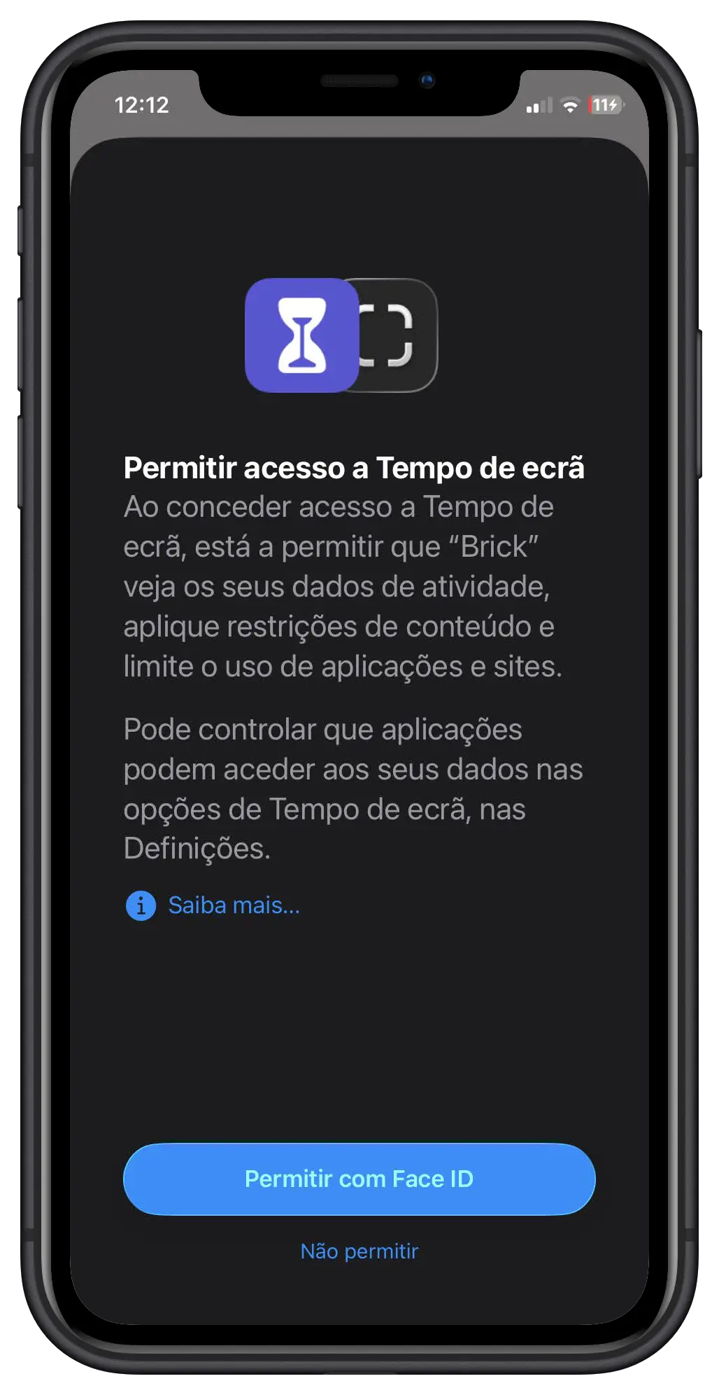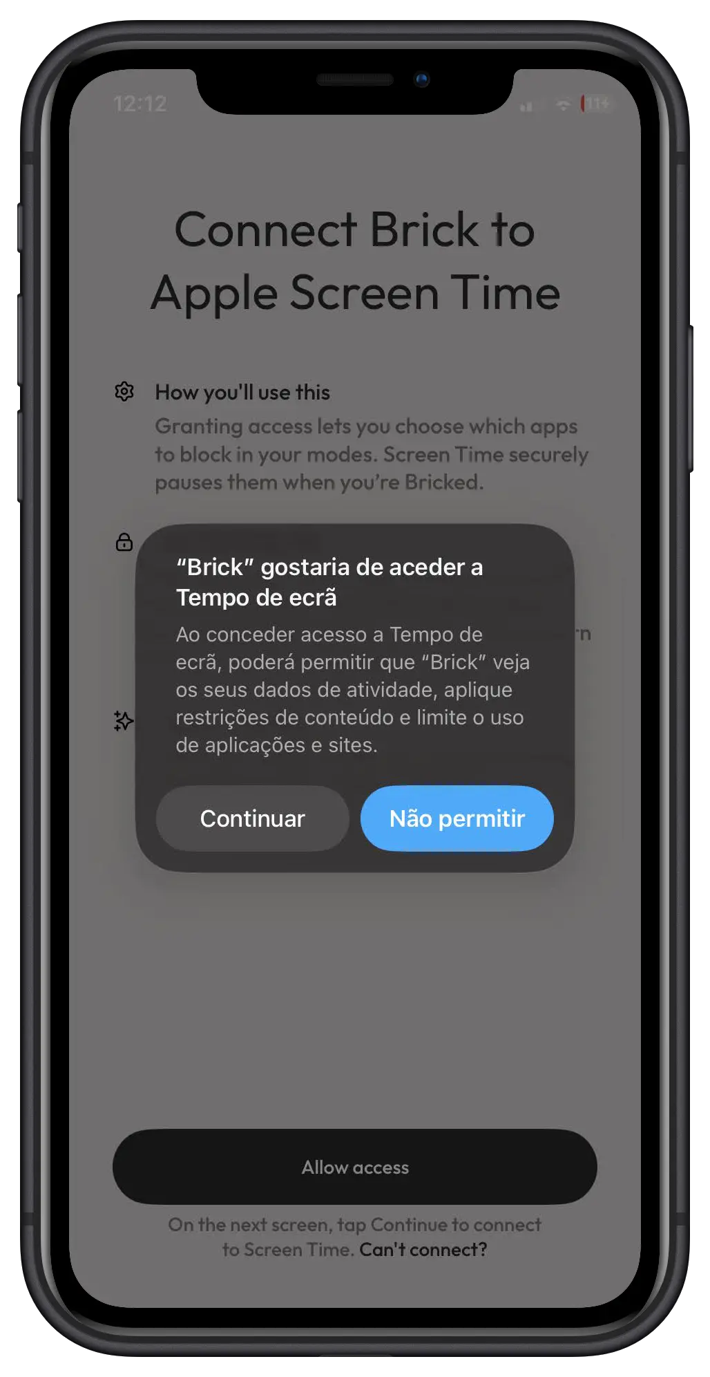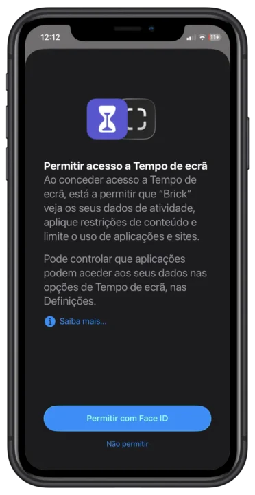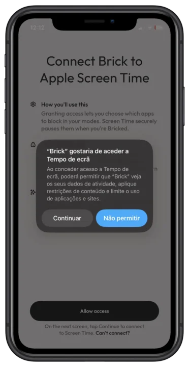 No iPhone, a app vai pedir acesso ao Tempo de ecrã; no Android, às Definições de acessibilidade. É isto que permite ao Brick bloquear ou permitir certas aplicações.