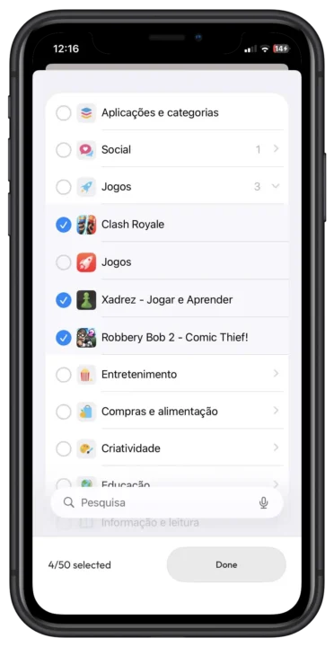 Pode selecionar manualmente as aplicações que quer "bloquear" - redes sociais, jogos, Safari, YouTube - ou usar categorias predefinidas.