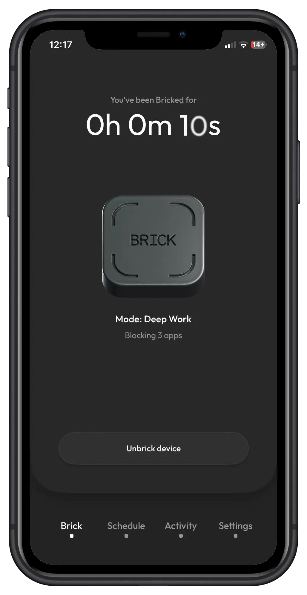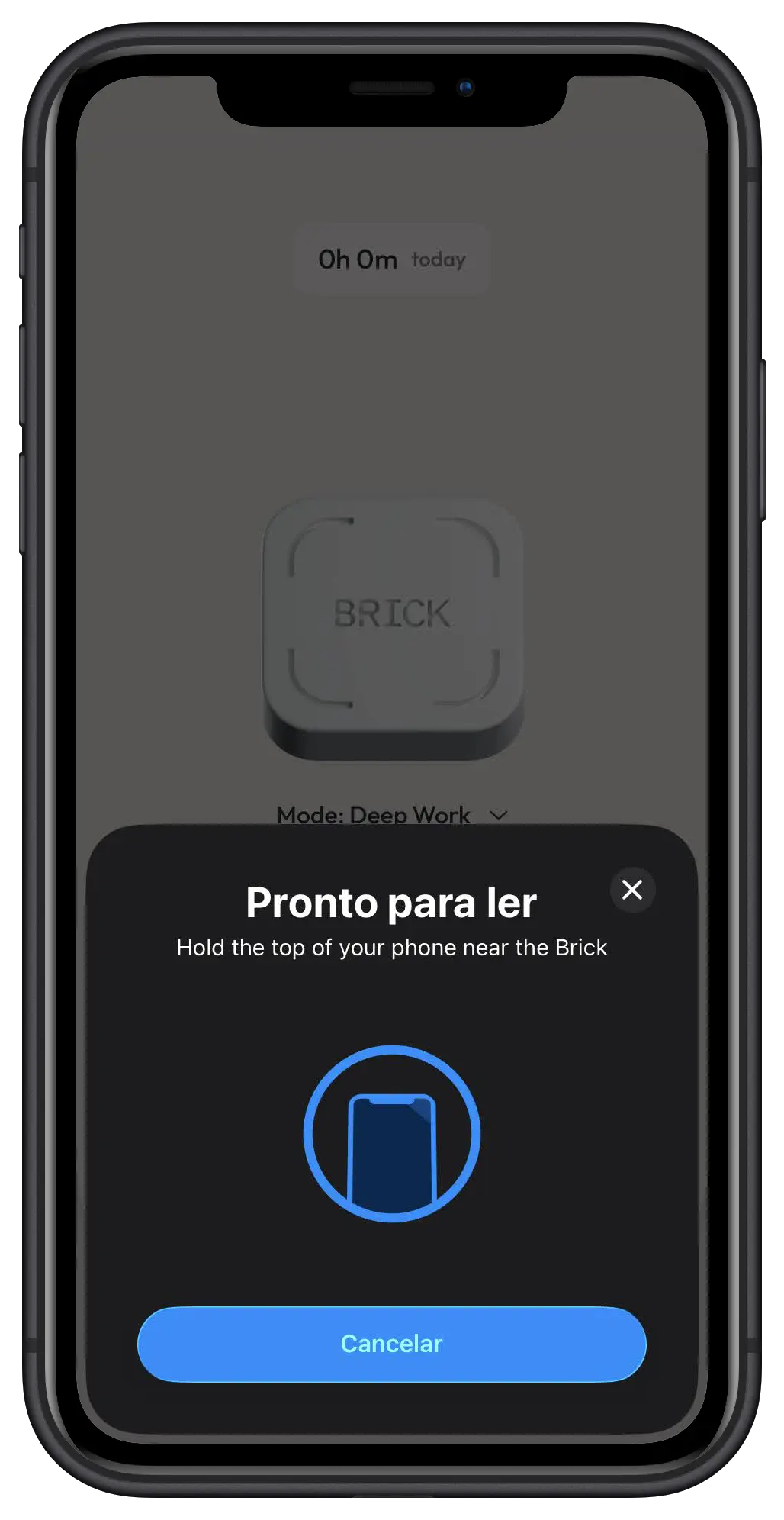 Abra a app, clique no botão principal "Brick device" e encoste o topo do seu telemóvel ao pequeno dispositivo físico. O ecrã escuro confirma que o modo está ativo.