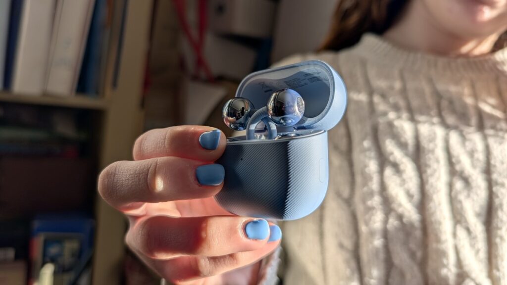Seja durante uma sessão de trabalho prolongada ou num treino intenso, a estabilidade é notável. Mesmo em movimentos bruscos ou atividades físicas vigorosas, como saltar à corda ou correr, os auriculares permanecem imóveis, validando a certificação IP57 que lhes confere resistência ao pó, à água e ao suor.