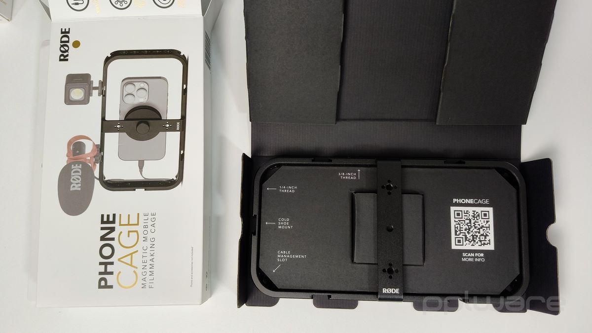 Também para utilizadores com dispositivos compatíveis com MagSafe, a RØDE oferece o RØDE Phone Cage, uma estrutura magnética de alta qualidade concebida para transformar os smartphones em rigs de filmagem profissionais. Com 33 roscas de montagem e cinco suportes cold shoe, permite a fixação de microfones, luzes, pegas, braços articulados, tripés e outros acessórios em diversas configurações. O seu disco magnético central proporciona uma fixação segura e rápida, facilitando a transição entre os modos retrato e paisagem, ideal para conteúdos em plataformas como TikTok, YouTube Shorts e Instagram Reels. Construído em alumínio de alta qualidade, combina robustez com leveza, sendo adequado tanto para gravações em estúdio como para filmagens em movimento.
