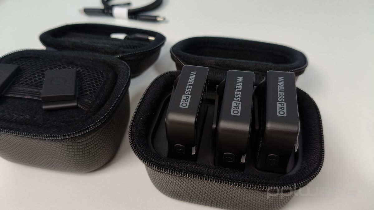 O conjunto inclui dois transmissores, um recetor, dois microfones de lapela Lavalier II, protetores de vento, clipes magnéticos MagClip GO, uma caixa de transporte com carregamento inteligente e um conjunto de acessórios com cabos e adaptadores. Esta caixa não só protege os equipamentos, como também permite carregamento rápido e transferência de dados eficaz, facilitando o trabalho fora do escritório.