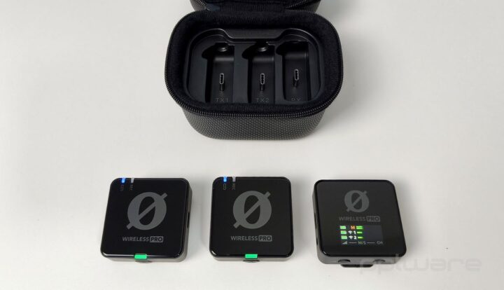 A interface do sistema é simples e intuitiva, com um ecrã LCD brilhante que exibe os níveis de áudio e controlos de fácil acesso para ajustes rápidos. A configuração pode ser personalizada através da aplicação RØDE Central, disponível para computador e dispositivos móveis, permitindo aos utilizadores adaptar o sistema às suas necessidades específicas. Além disso, o Wireless PRO inclui uma saída para auscultadores com controlo de volume, possibilitando monitorização em tempo real e a adição de um terceiro canal de áudio, como por exemplo um microfone de narração.