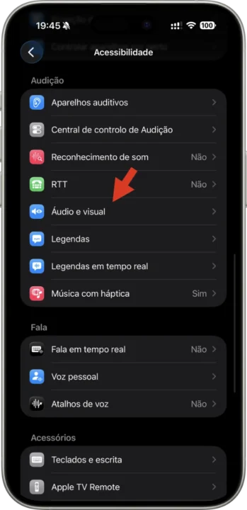 - Abra a aplicação Definições e vá a Acessibilidade -> Áudio e visual.