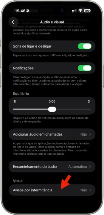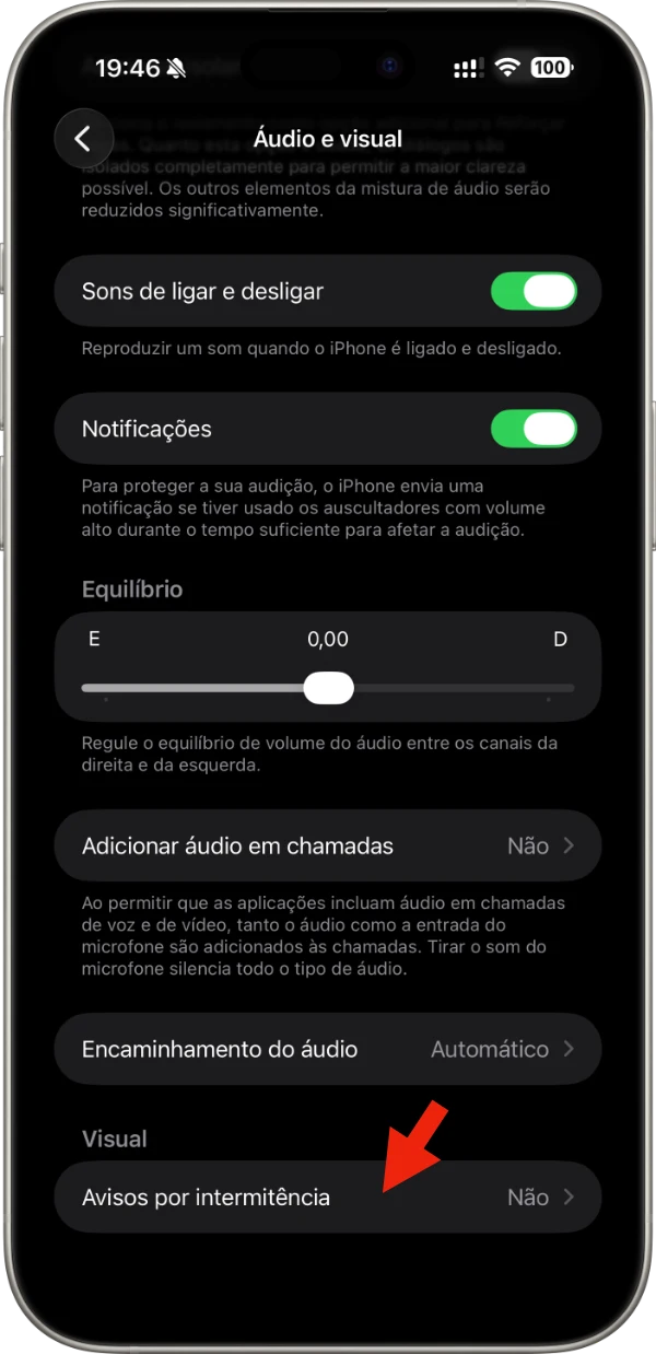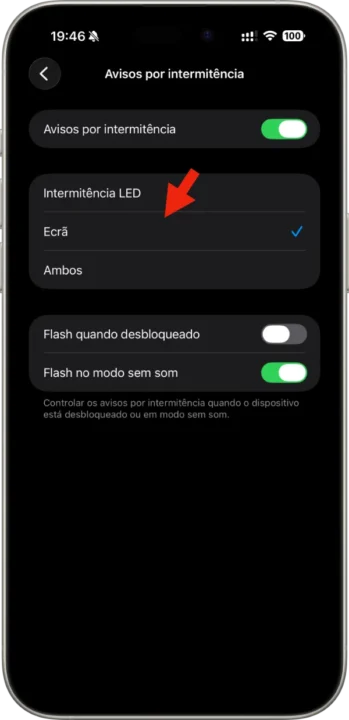 - Ative a opção Avisos por intermitência, selecione Ecrã e confirme que a opção Flash no modo sem som está ativada.