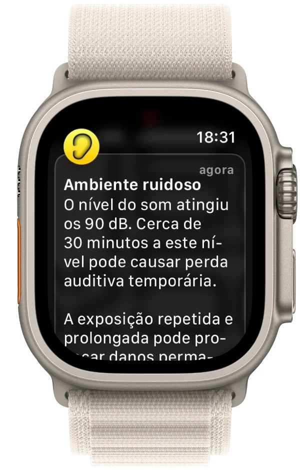 Se o relógio detetar níveis acima de 80 dB de forma repetida e prolongada, passa a indicação para “Ruidoso” e envolve recomendar reduzir exposição, usar proteção auditiva ou afastar-se da fonte.