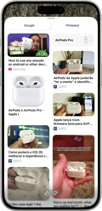 - A opção Pesquisar mostra imagens similares via pesquisa visual; pode ainda desenhar com o dedo para focar parte da imagem.