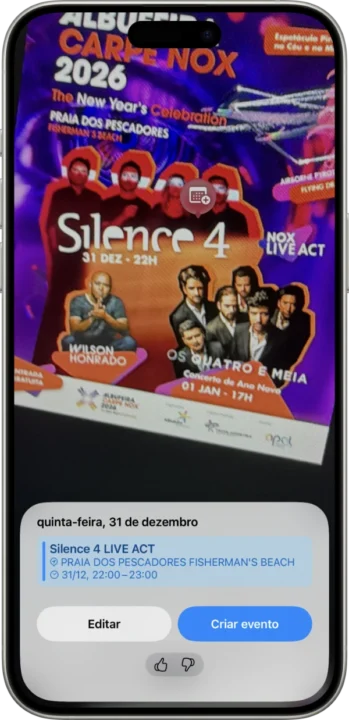 - Apontar a câmara para um cartaz de concerto: a Inteligência visual pode detetar a data e permitir “Adicionar ao Calendário”.