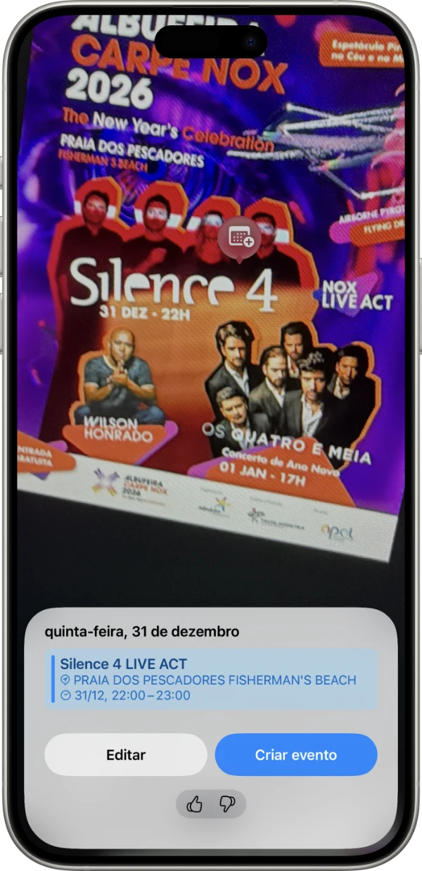 - Apontar a câmara para um cartaz de concerto: a Inteligência visual pode detetar a data e permitir “Adicionar ao Calendário”.