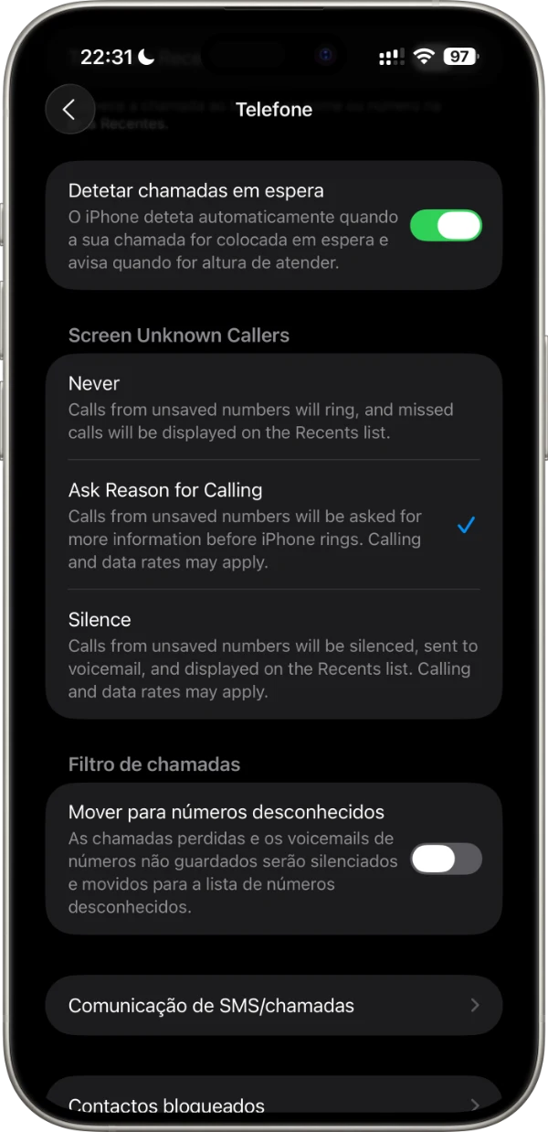 Com o regresso da função “Silenciar Chamadas Desconhecidas”, agora integrada no Call Screening, a Apple oferece três opções distintas, que permitem ao utilizador escolher o nível de filtragem: