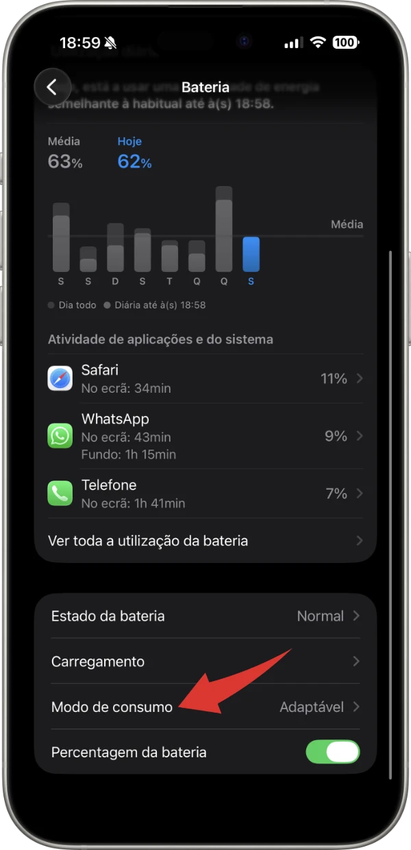 Consumo adaptável é uma nova funcionalidade do iOS 26 disponível no iPhone 15 Pro e modelos posteriores, que atua automaticamente em segundo plano para poupar bateria, com o objetivo de ajudar o utilizador a chegar ao fim do dia com a carga restante.