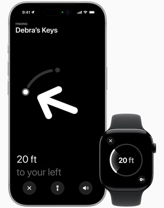 A funcionalidade mais destacada da atualização é a introdução do Localização precisa diretamente no Apple Watch para os novos AirTag 2.