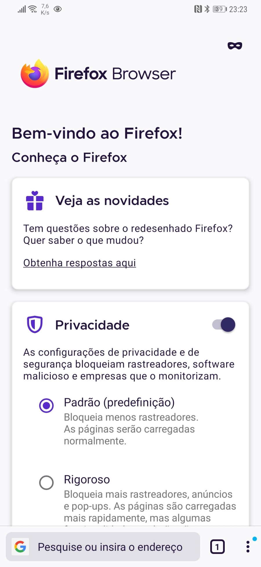 Há também a chegada do modo escuro, que é simples de ativar e segue a mesma filosofia que outras apps já tomaram. No campo da privacidade as melhorias são grandes, como na versão desktop. Todas podem ser ativadas no primeiro ecrã, mas estão depois acessíveis nas definições do Firefox.