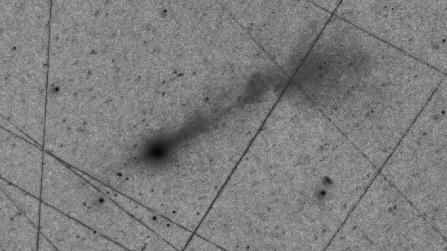 Imagem profunda empilhada do 3I/ATLAS, captada entre 5:08 e 5:22 UT em 9 de novembro de 2025, através da combinação de 5 exposições, cada uma com duração de 3 minutos, com dois telescópios. A direção do sol está no canto inferior esquerdo. (Crédito: Frank Niebling e Michael Buechner, publicado aqui)
