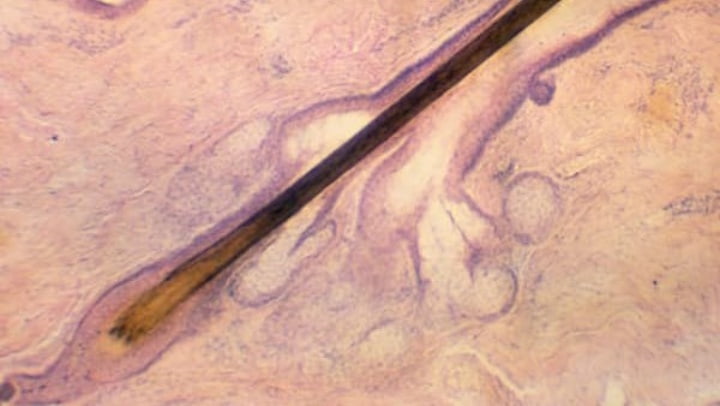 Folículo capilar, uma estrutura complexa localizada na derme, responsável pela produção e crescimento dos fios de cabelo.