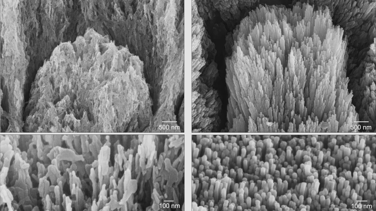 Imagens de microscopia eletrónica de um dente com esmalte desmineralizado mostrando cristais de apatita erodidos (à esquerda) e um dente desmineralizado semelhante após um tratamento de duas semanas mostrando cristais de esmalte regenerados epitaxialmente (à direita).