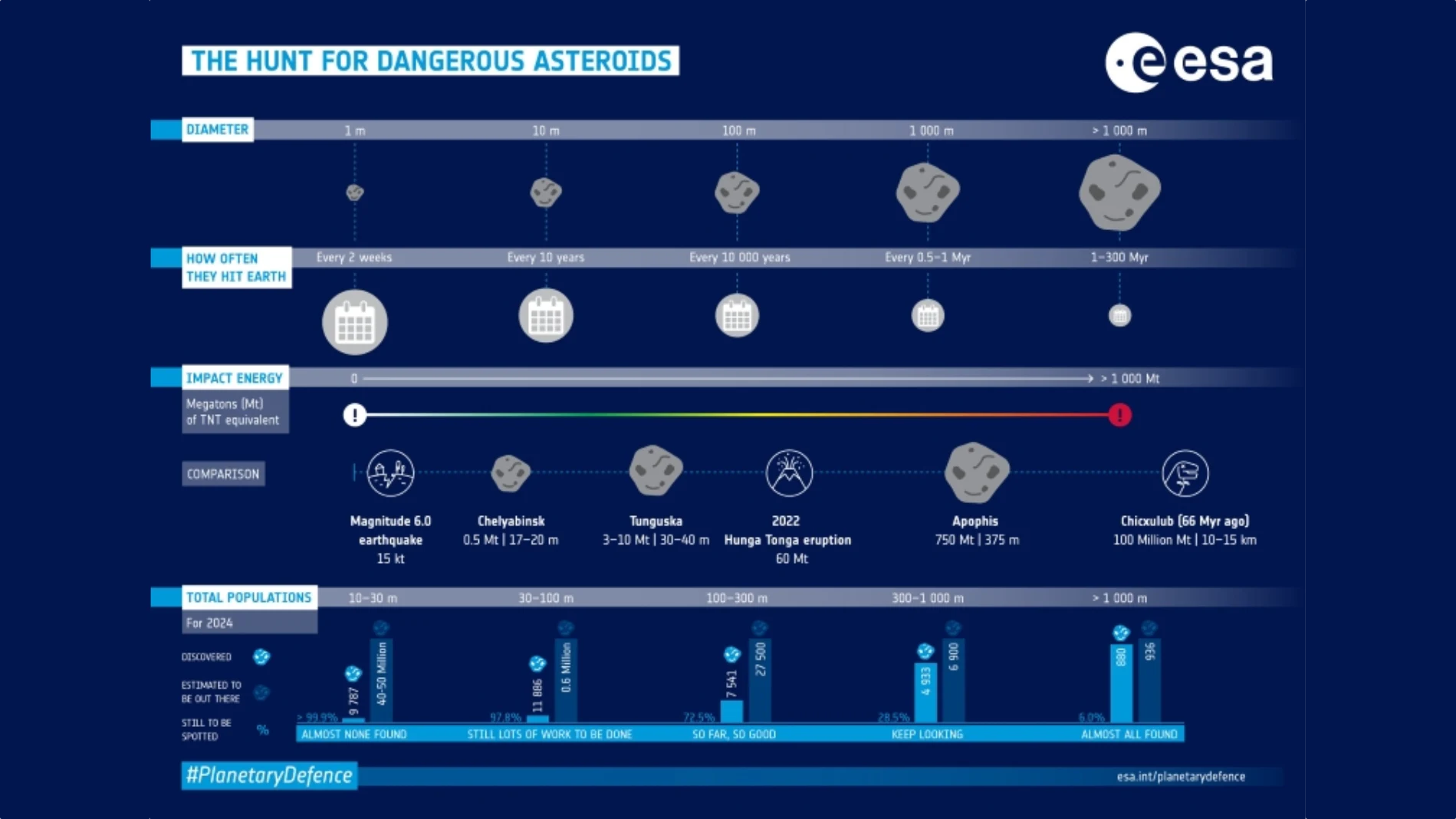 Importa referir que os maiores NEAs, aqueles com mais de 1 quilómetro de diâmetro, são também os mais fáceis de detetar. Muitos foram dos primeiros a ser encontrados. Estes objetos causariam efeitos globais se atingissem a Terra, mas a comunidade científica está confiante de que já identificou a vasta maioria.