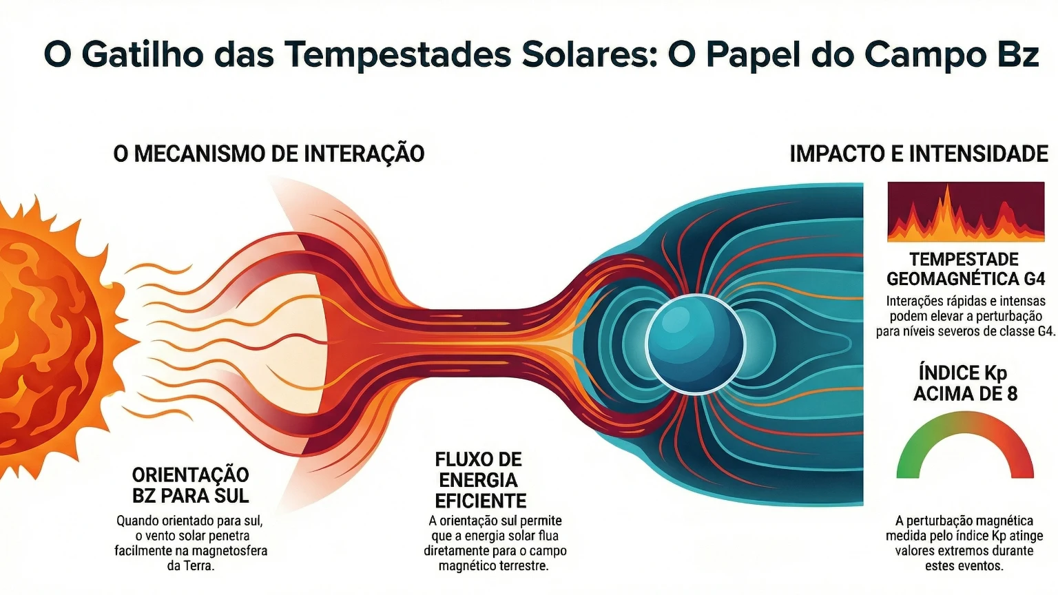 O Bz representa a componente norte–sul do campo magnético do vento solar. Quando é positivo, a energia solar tem dificuldade em entrar na magnetosfera terrestre, reduzindo a actividade geomagnética. Quando é negativo, o campo solar fica oposto ao da Terra, facilitando a entrada de energia, intensificando tempestades geomagnéticas e aumentando a probabilidade de auroras e impactos em satélites e comunicações.