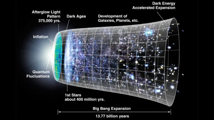 Esta imagem ilustra a evolução do Universo desde o Big Bang até hoje, ao longo de 13,77 mil milhões de anos. Começando com flutuações quânticas, seguiu-se uma fase de rápida inflação, o arrefecimento da matéria, a formação das primeiras estrelas e galáxias, e o aparecimento das estruturas cósmicas.