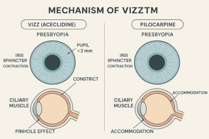 Conforme partilhado pela empresa, o VIZZ atua reduzindo suavemente a pupila do olho, utilizando aceclidina. Desta forma, cria um chamado pinhole effect, semelhante ao estreitamento da lente de uma câmara, que ajuda a focar objetos próximos com maior nitidez.
