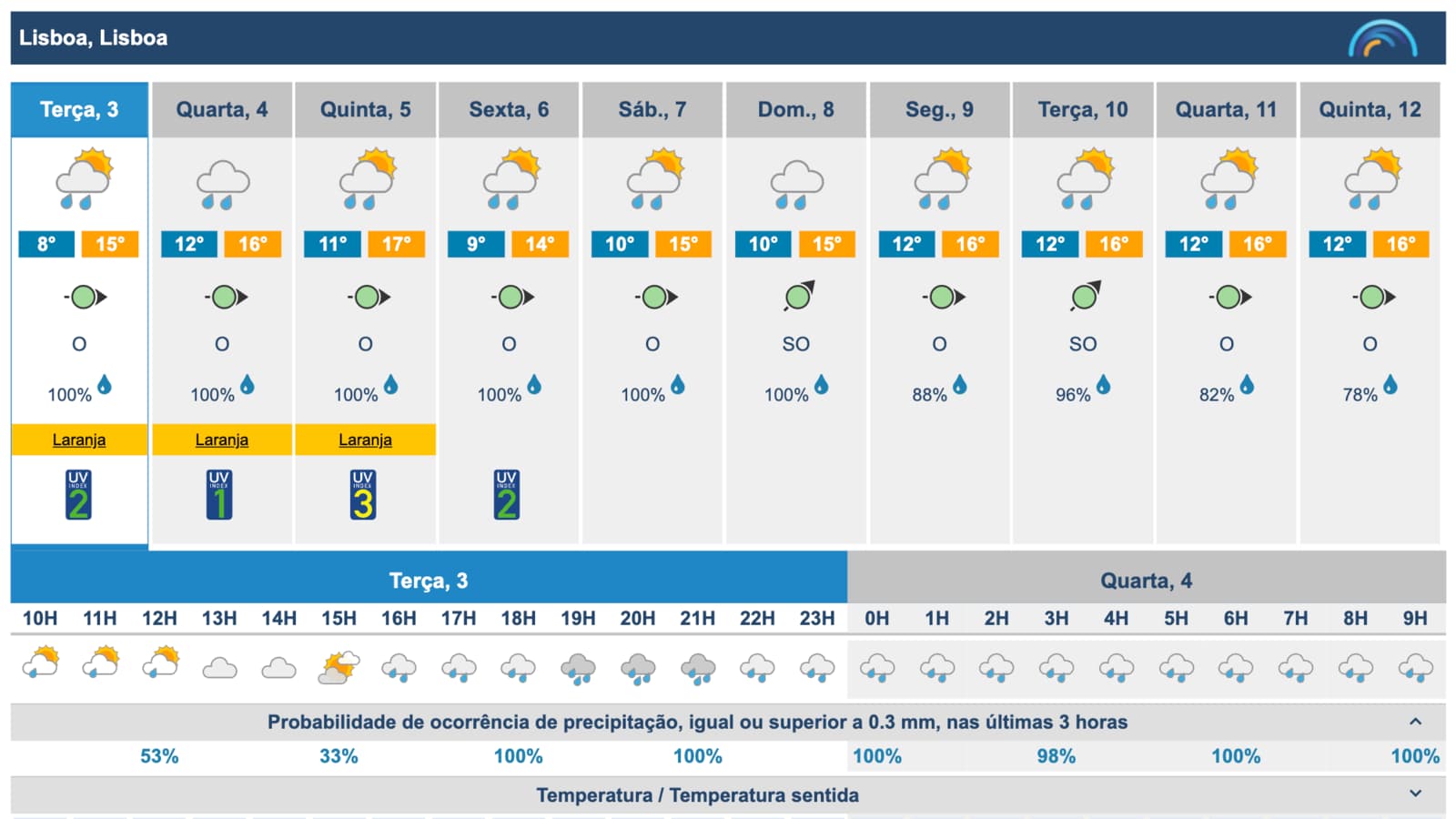 O Instituto Português do Mar e da Atmosfera (IPMA), por exemplo, informa sobre a probabilidade de ocorrência de precipitação, igual ou superior a 0.3 mm, nas últimas três horas.