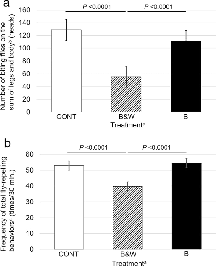 Número de moscas nas patas e no corpo (a) e a frequência total do comportamento repelente (b) das vacas experimentais. Fonte: Kojima T, Oishi K, Matsubara Y, Uchiyama Y, Fukushima Y, Aoki N, et al. (2019) Cows painted with zebra-like striping can avoid biting fly attack. PLoS ONE 14(10)