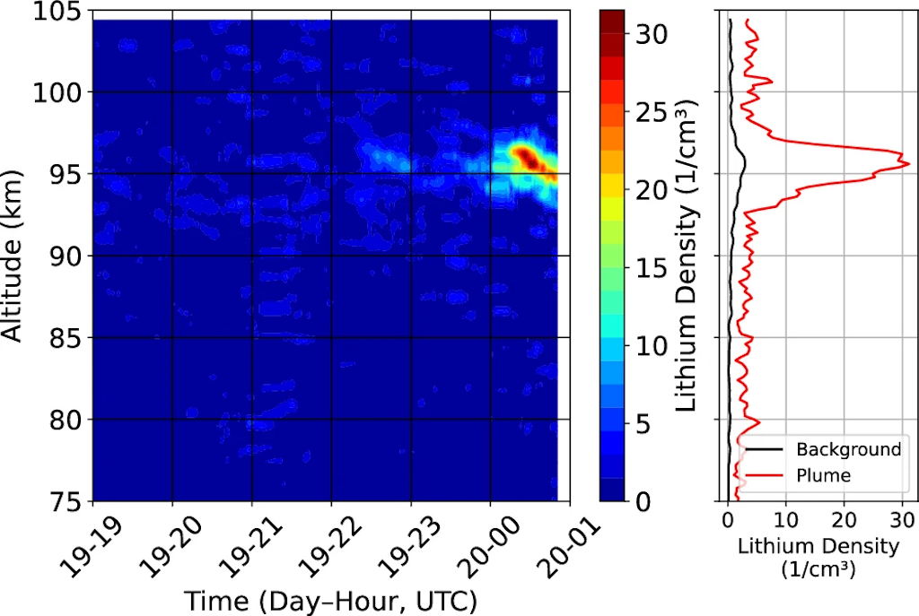 Observação de lítio na noite de 19/20 de fevereiro de 2025. Densidade máxima de lítio antes da chegada do rasto (19/02/2025 às 19:00 a 20/02/2025 às 00:21 UTC). Fonte: Wing, R., Gerding, M., Plane, J.M.C. et al. Measurement of a lithium plume from the uncontrolled re-entry of a Falcon 9 rocket. Commun Earth Environ 7, 161 (2026).