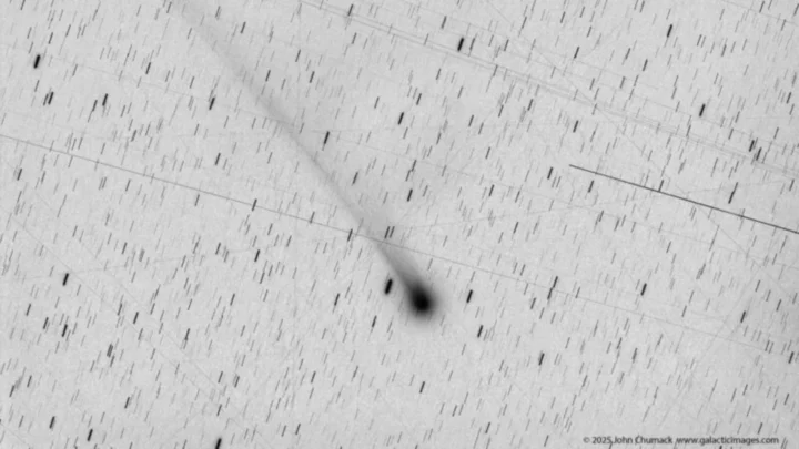 John Chumack, em Yellow Springs, Ohio, captou o cometa Lemmon (C/2025 A6) em 27 de setembro de 2025. John escreveu: “Tráfego intenso de satélites enquanto fotografava este cometa... as estrelas estão desfocadas porque estou a acompanhar o núcleo e o movimento do cometa através das estrelas de fundo... das 44 imagens separadas de 60 segundos tiradas naquela manhã, apenas 6 não tinham rastros de satélites.”