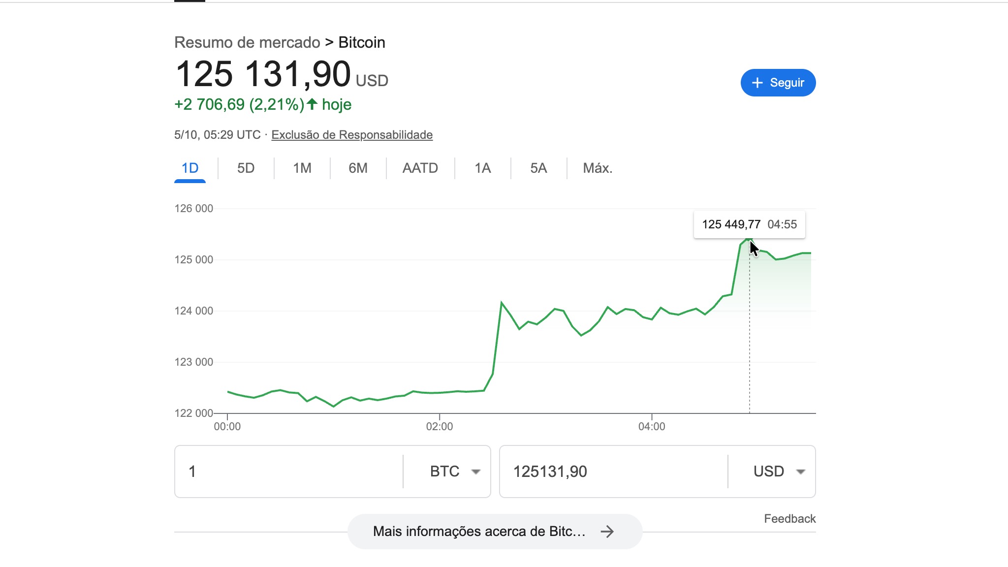 Bitcoin atinge novo recorde histórico e ultrapassa os US$ 124 mil