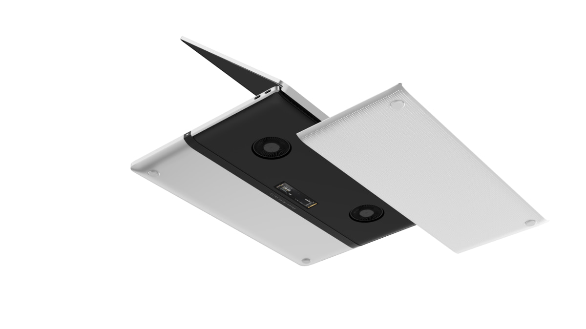 Com uma estrutura fina e elegante, o computador portátil possui três portas USB-C, bem como um painel inferior amovível, com duas ventoinhas de arrefecimento.