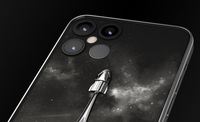 Designado iPhone 12 Discovery Musk Be On Mars, o smartphone tem um revestimento de titânio e na parte traseira apresenta imagem esculpida que simboliza os voos da aeronave Dragon.