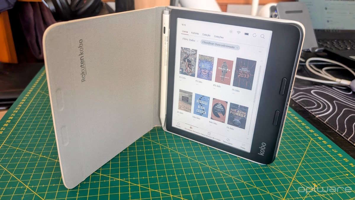 O Kobo Libra Colour é compatível com a caneta Kobo Stylus 2 (vendida separadamente), permitindo anotações diretamente nos livros ou em cadernos digitais dedicados.