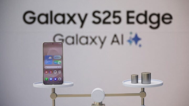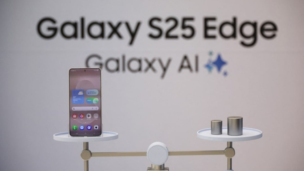Galaxy S25 Edge em exposição num evento da Samsung, em Seul, na Coreia do Sul, no dia 13 de maio. Crédito: Reuters/ Kim Hong-Ji