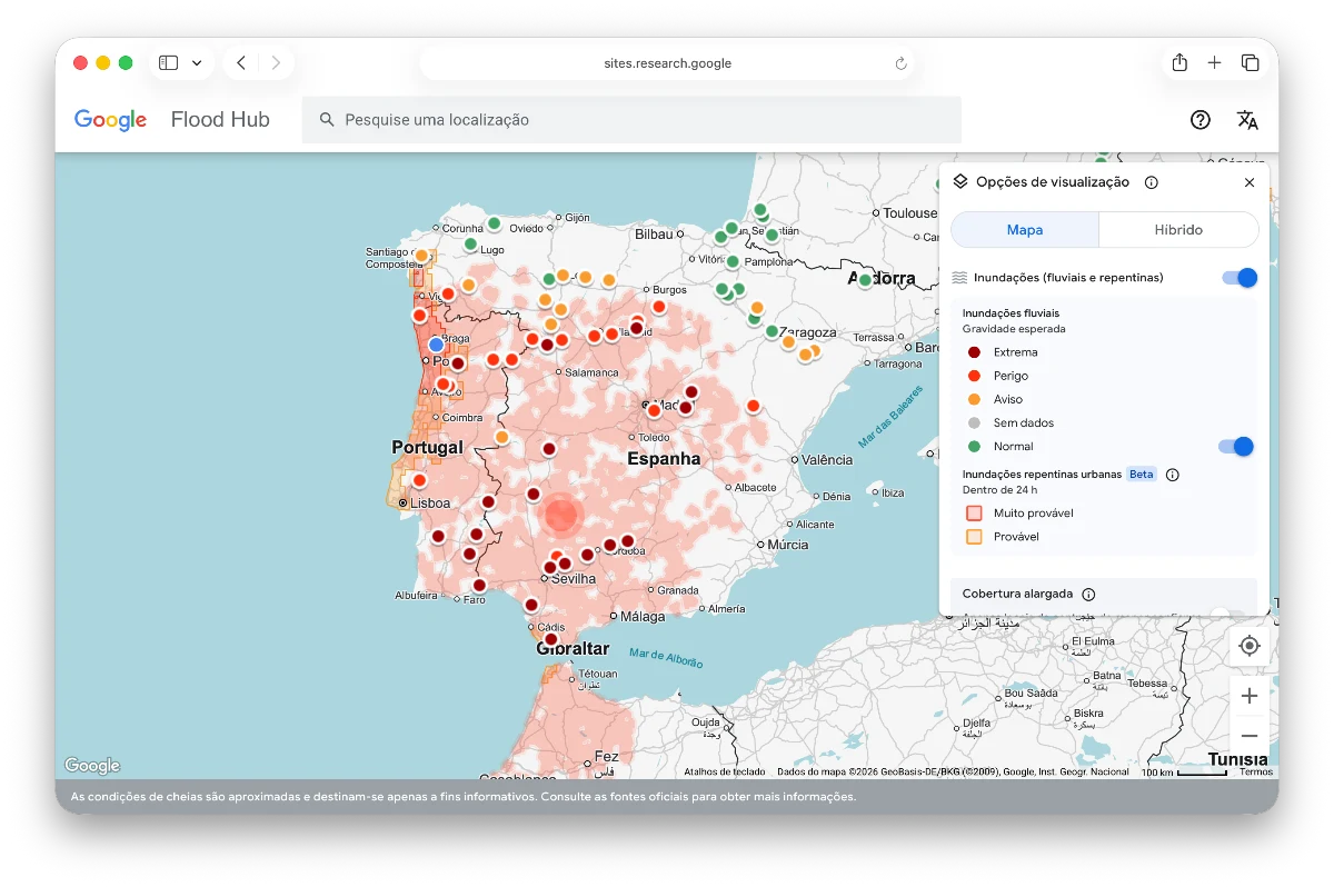 Para aceder a este mapa, tem de ir ao site sites.research.google/floods. Isso irá abrir um mapa do mundo, com uma coluna à direita onde pode ativar ou desativar as visualizações.