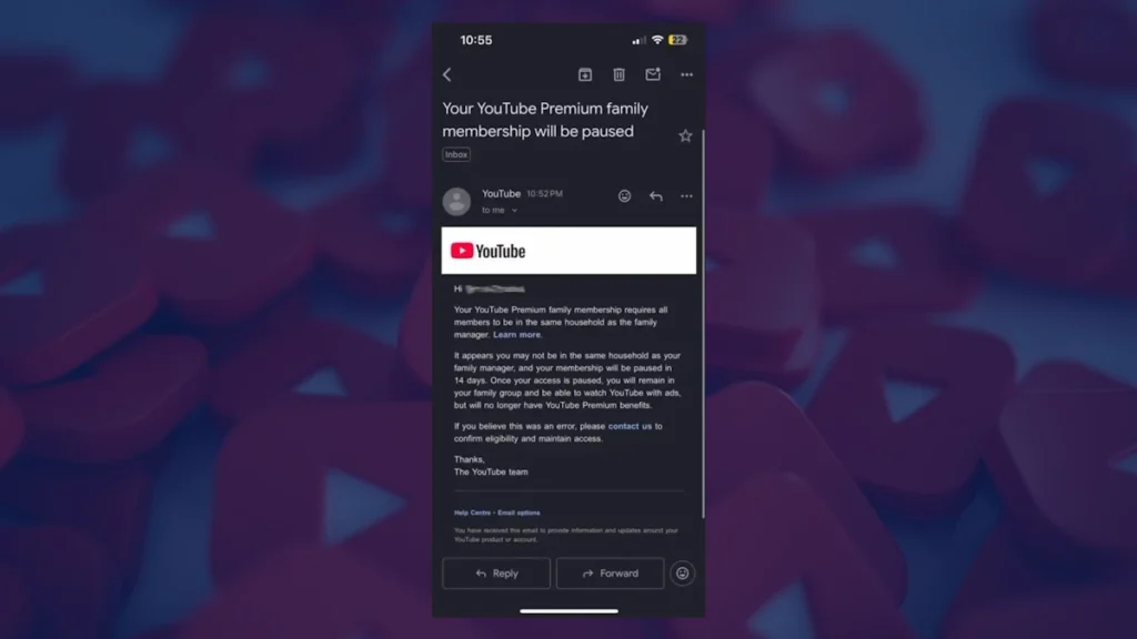 O alerta chega através de um email com um aviso claro: "a sua subscrição YouTube Premium familiar vai ser pausada". A justificação apresentada pela empresa é igualmente direta, afirmando que "parece que não está no mesmo agregado familiar que o gestor da família".
