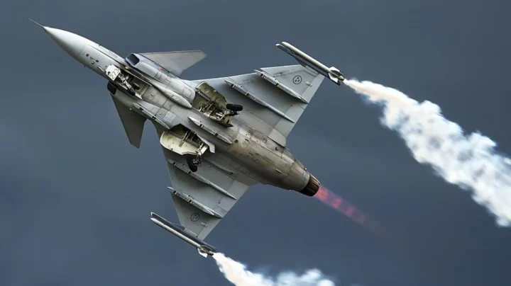 Caça Gripen sueco, monomotor capaz de atingir Mach 2, com alcance superior a 3.000 km, baixo custo operacional e integrado com mísseis Meteor e sistemas avançados de guerra eletrónica, destacando-se pela agilidade e eficiência em operações modernas.