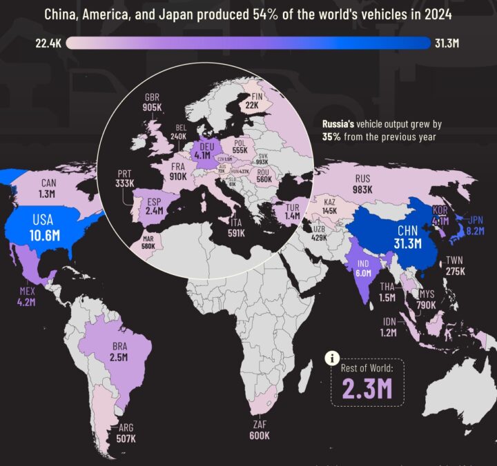 A resposta é clara e vem ilustrada num mapa elaborado pelo Visual Capitalist com dados da OICA (International Organization of Motor Vehicle Manufacturers). O grande nome é a China.
