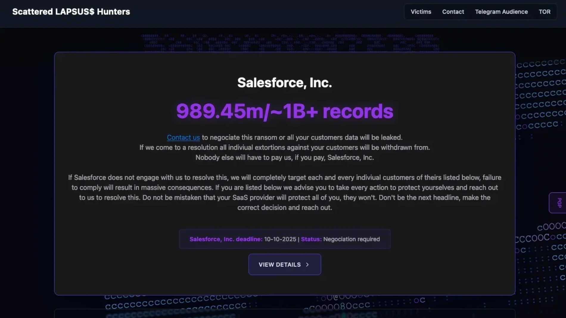 O grupo criminoso exige que as empresas afetadas e a própria Salesforce entrem em contacto até 10 de outubro para negociar o pagamento do resgate.