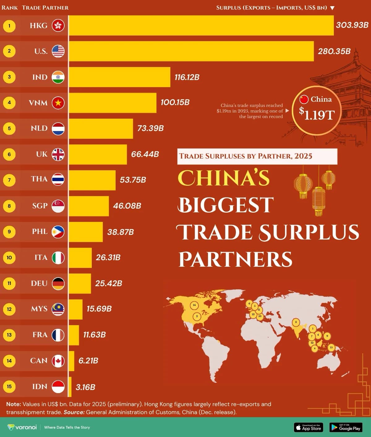 Apesar das tensões globais e de uma conjetura geopolítica cada vez mais atribulada, o superavit comercial da China atingiu 1,19 biliões de dólares (em inglês, $1.19 trillion) em 2025. Eis os 15 países que contribuíram para isso.