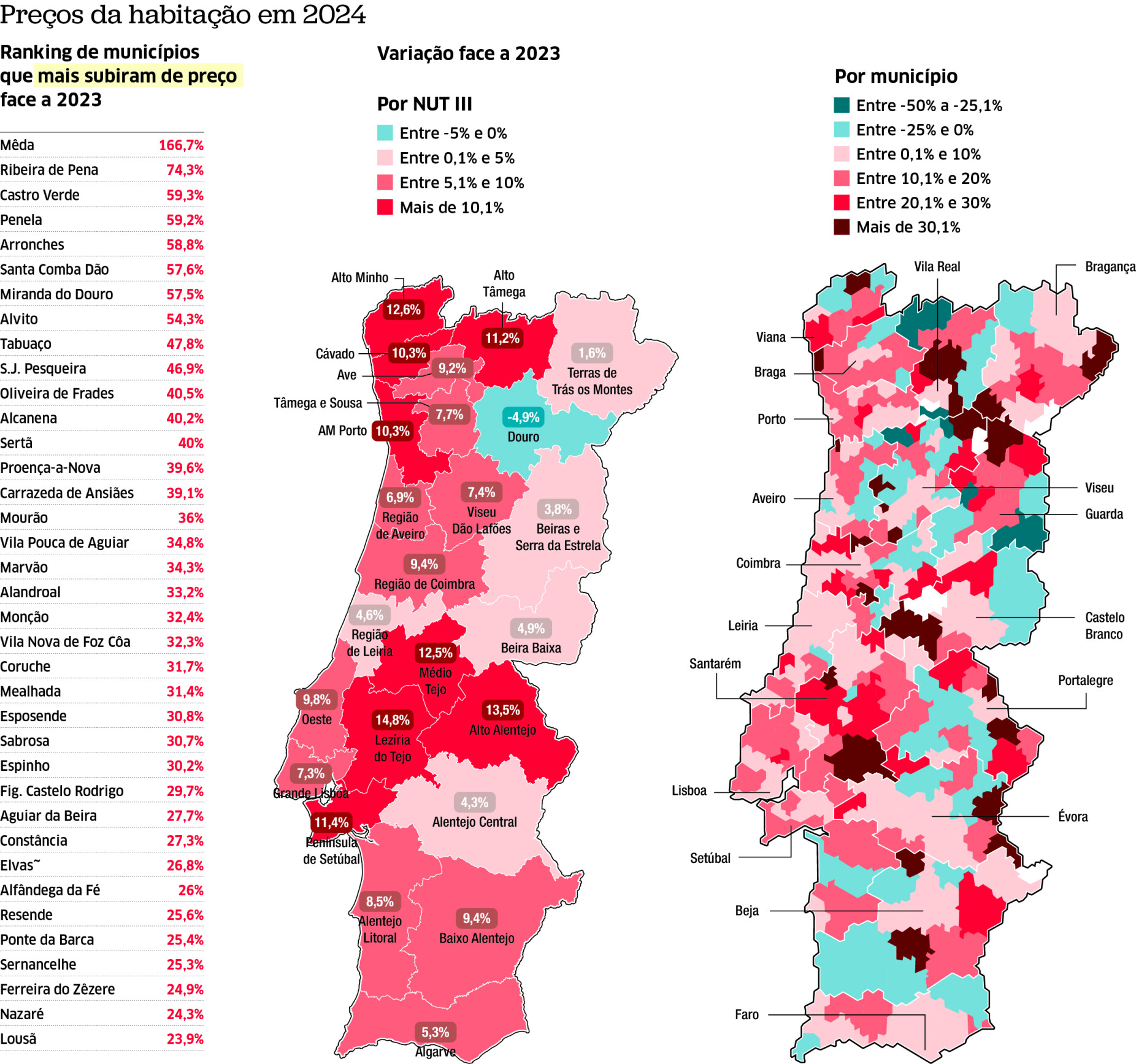 Embora tenha havido um aumento generalizado nos preços da habitação em várias regiões do país, a Mêda registou um aumento de 166,7% no preço das habitações, face ao ano de 2023. De acordo com as informações, passou de 156 euros por metro quadrado (m2) para 416 euros em 12 meses.