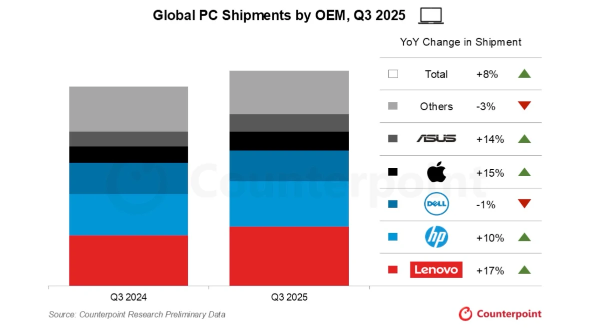 A Lenovo manteve a sua liderança no mercado, com um aumento de 17,4% nas vendas no terceiro trimestre de 2025.