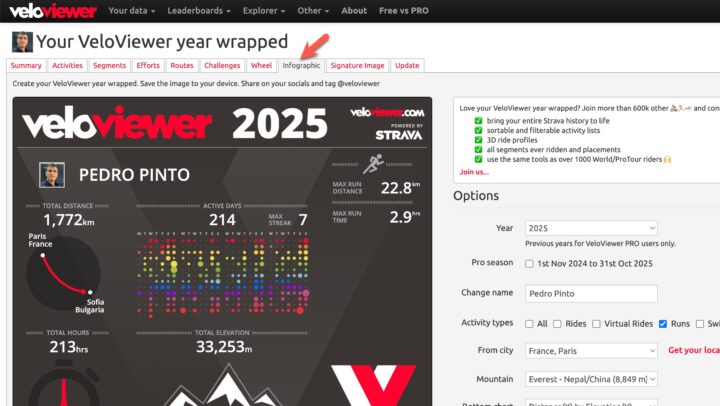 Sabia que o VeloViewer cria automaticamente um resumo anual (“Year Wrapped” / infográfico) com as distâncias registadas (corrida, ciclismo, caminhada, etc.) com base nos seus dados do Strava? Veja como funciona.