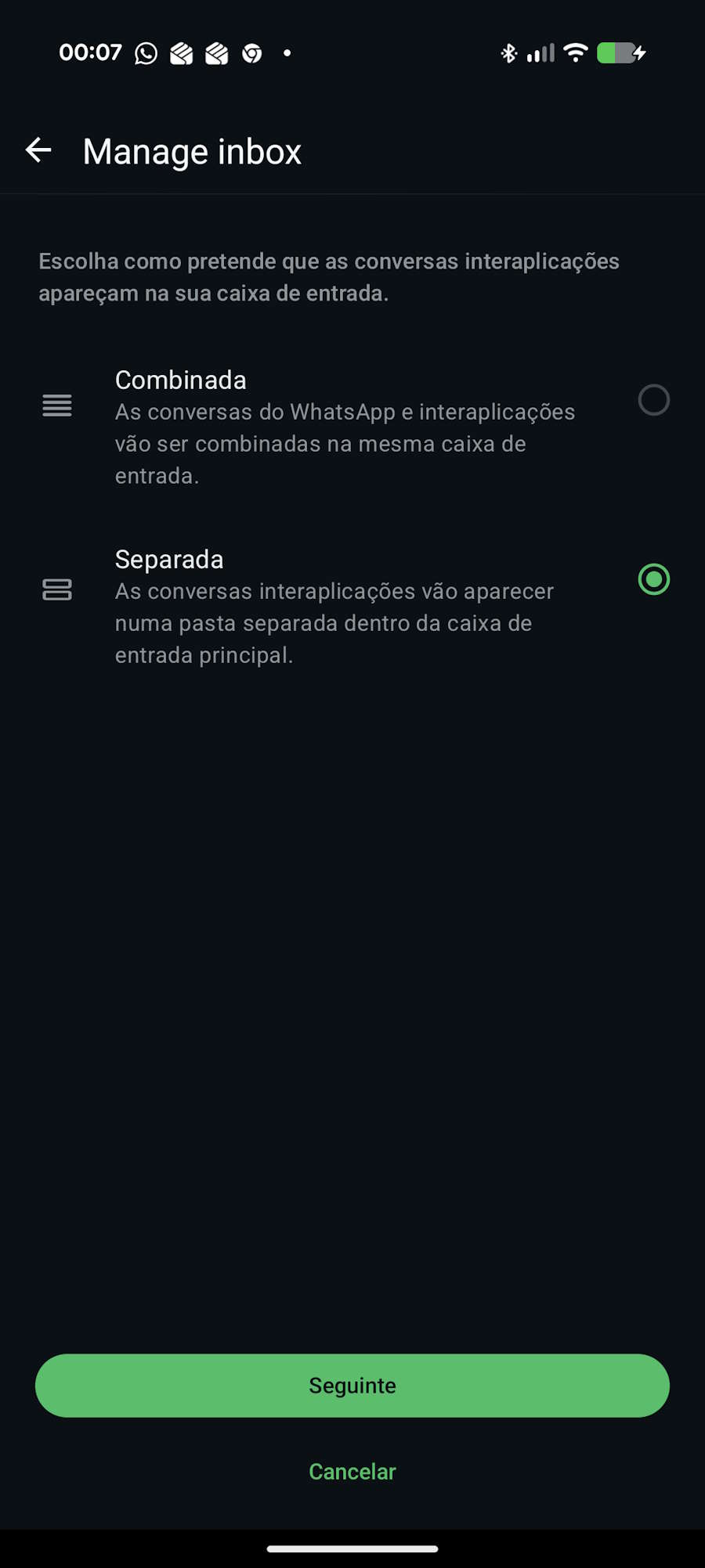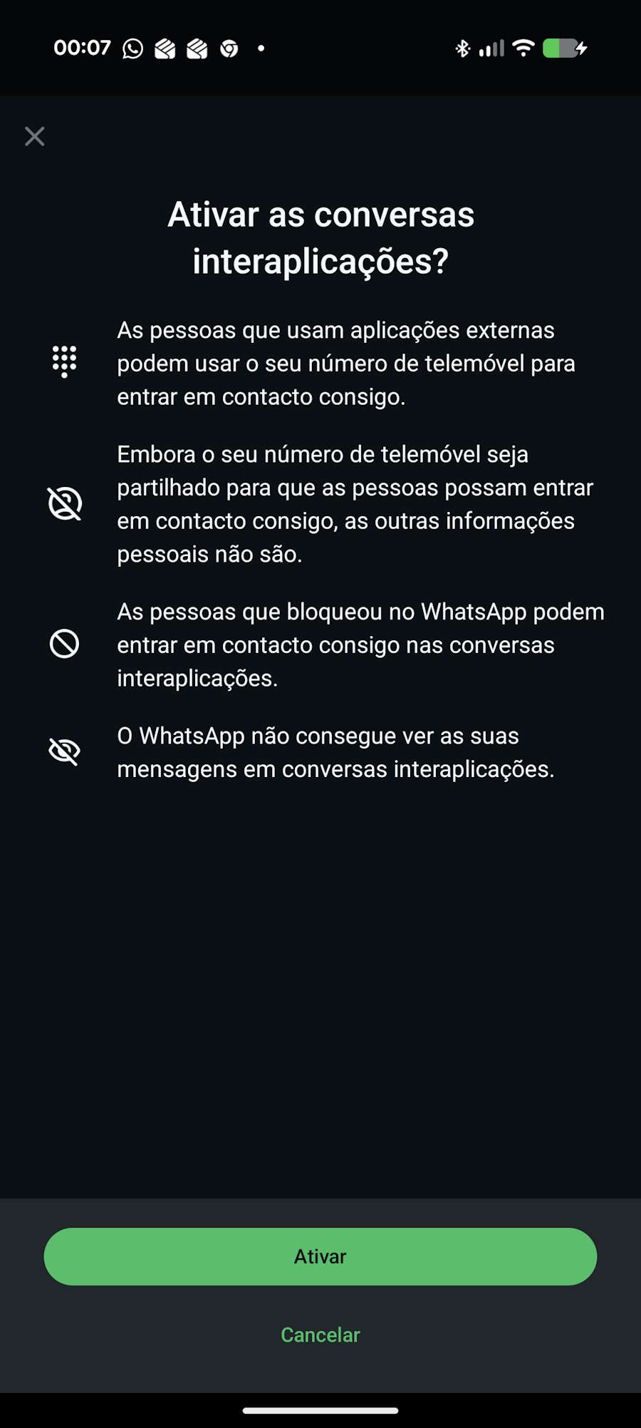 Quando os utilizadores se ligarem a outras plataformas pela primeira vez, o WhatsApp irá guiá-los através de um processo de integração. Quer assim garantir que compreendem as principais diferenças entre as conversas padrão do WhatsApp e as conversas de terceiros.