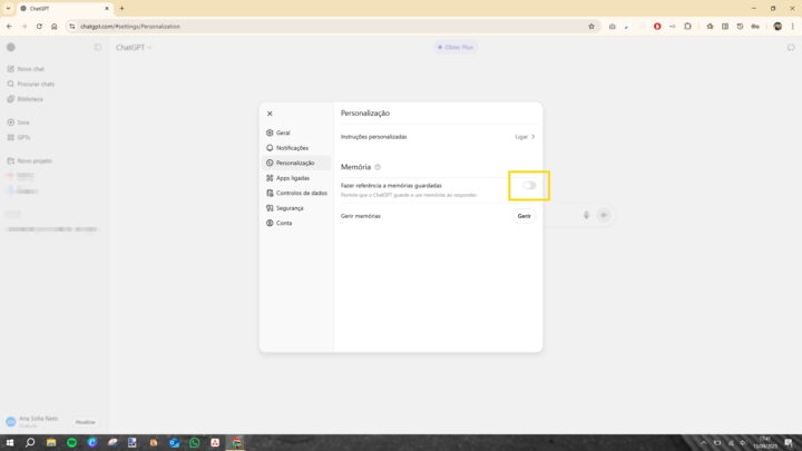 Depois, aceda ao menu Personalização e ative o botão que "Permite que o ChatGPT guarde e use memórias ao responder".