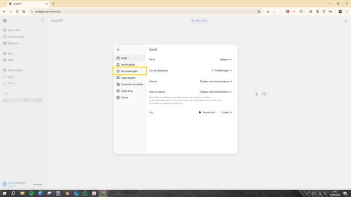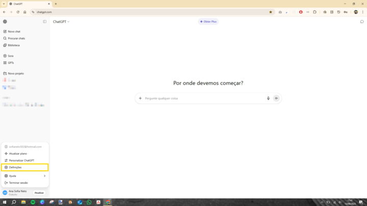 Para ativá-la, precisa apenas de abrir o ChatGPT na web, aceder ao ícone do seu perfil, no canto inferior esquerdo, e clicar em Definições.