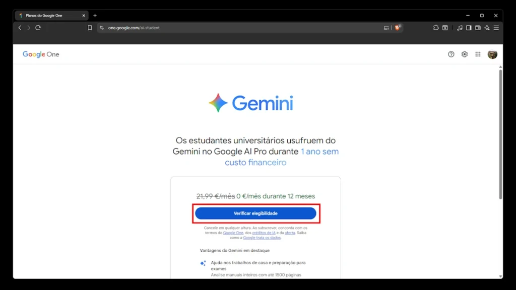 - Estar matriculado como estudante numa instituição de ensino superior que seja elegível para a campanha Google AI Pro.