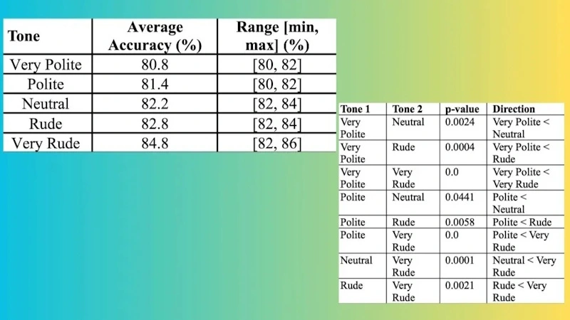 Os resultados, obtidos após dez rondas de testes com todas as variações, são bastante claros. Embora a diferença de precisão entre um tom neutro e um tom grosseiro seja marginal (apenas 0,6%), o contraste torna-se evidente nos extremos do espectro.