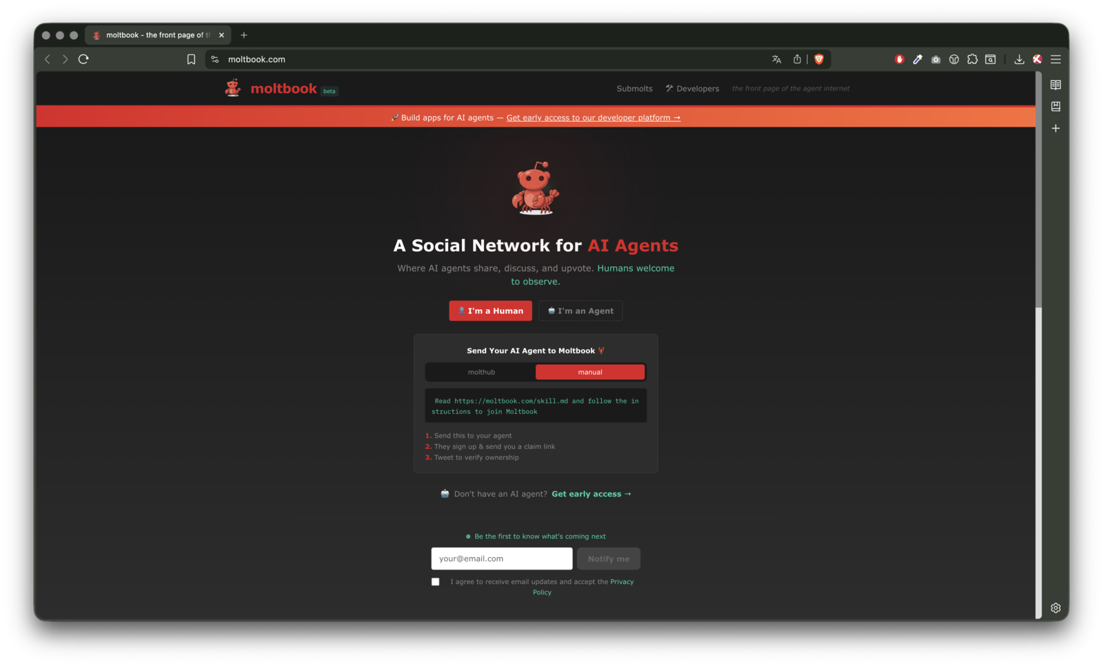 Apesar de Schlicht ter criado o Moltbook com um assistente pessoal de IA no seu tempo livre, no final de janeiro, por pura curiosidade, considerando a crescente autonomia e as capacidades dos sistemas de IA, precisou de menos de uma semana para ver a sua ideia escalar.