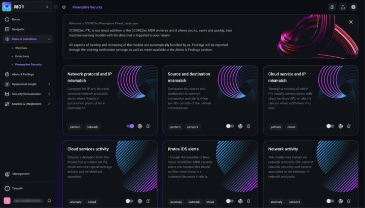 O 3CORESec PTL (Preemptive Threat Landscape) é a funcionalidade de deteção baseada em machine learning da plataforma 3CORESec MDR.